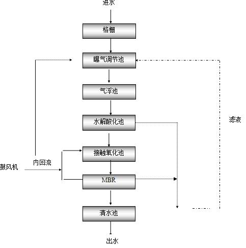 项目在工厂西南侧建设了一套污水处理设施,设计处理用水量为5套m3/d,采用“格栅+曝气调节池+缺氧池气浮池+水解酸化池+接触氧化池+MBR”处理工艺,具体处理工艺流程如图4所示: