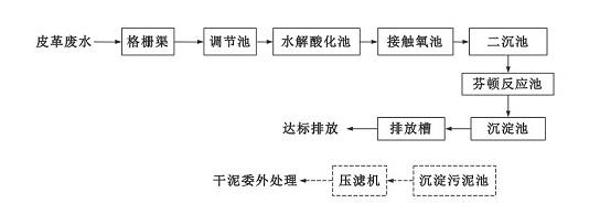 皮革生产过程中,大多数的水污染物是在湿加工过程(浸灰、鞣制)产生。皮革加工废水中含有动植物油脂、毛屑、肉屑、泥沙、灰渣等悬浮物和角质蛋白、红血蛋白等溶解性有机物,以及皮革加工过程中填价铬、硫化物、氯化物等无机盐类。大多数皮革厂一般采用Ca(OH)2、Na2S脱毛和铬鞣技术,此废水因含有较高浓度的铬盐和硫化物等毒物,因此废水处理工艺复杂,费用较高。